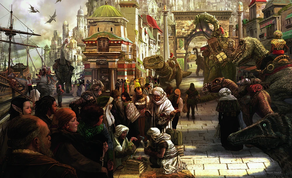 Guided by Corema’s spell, they navigated the labyrinthine streets of Port Nyanzaru with a purpose. Corema, familiar with the object they sought, had been able to cast the spell that now led them. Their journey first took them through the Grand Souk, a place teeming with life and commerce. It was one of the three beating hearts of Port Nyanzaru—the others being the jewel market and the Red Bazaar. The Grand Souk stood out as the grandest among them, a hub where traders from up and down the Sword Coast converged. From timber, spices, medicines concocted from jungle plants, to dinosaur skulls and claws, iron, tiger pelts, carved ivory, Batiri and grung handiwork, colored feathers, tropical fruit, monkeys, plesiosaur meat—all the riches of Chult were traded here.